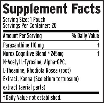 Nurox pouches combine clinically studied nootropics and natural compounds that enhance energy, focus, and mood. Each pouch contains Paraxanthine (110 mg), Alpha-GPC, N-Acetyl L-Tyrosine (NALT), L-Theanine, Rhodiola Rosea, and Kanna Extract.